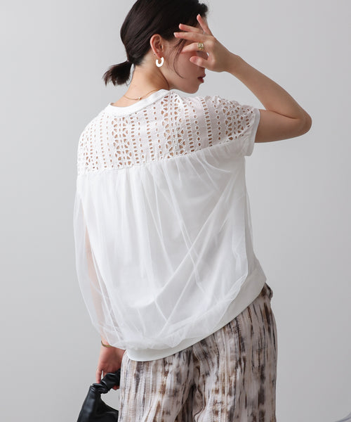 後ろ姿で差をつける、大人フェミニンな異素材トップスは 繊細なレースと、ふんわり広がるチュールを組み合わせたバックデザインが目を惹く一枚。 シンプルなフロントとのギャップで、360度どこから見ても印象的なスタイルに。 パンツにもスカートにも合わせやすく、カジュアルからお出かけスタイルまで幅広く活躍します。