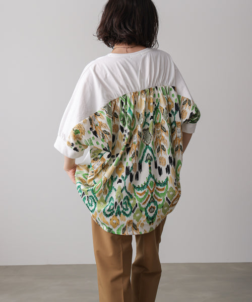 インパクトがある柄をドッキングした主役カットソー! 背中部分にダイナミックな柄素材をドッキングしているので、1枚で様になります。 前身頃のカットソー部分は、毛羽立ちしにくい加工をしているので、 キレイな印象があり女性らしい印象のカットソーです。 加工のおかげで長くキレイな状態がたもたれます◎