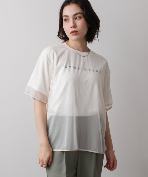 シンプルなTシャツに、ほんの少しの特別感をプラス。着るだけでさりげなくおしゃれに見える、大人に嬉しいプルオーバーです。毎日のコーデに取り入れやすいのに、ひと味違う表情を楽しめる一枚です。柔らかなTシャツ生地に、透け感のあるチュールをレイヤード。軽やかな雰囲気が加わり、シンプルなスタイルもぐっと洗練されます。袖口や裾には異素材のパイピングを施し、動くたびにさりげないアクセントに。内側には小さなロゴがあしらわれ、控えめながらも遊び心を感じるデザインです。