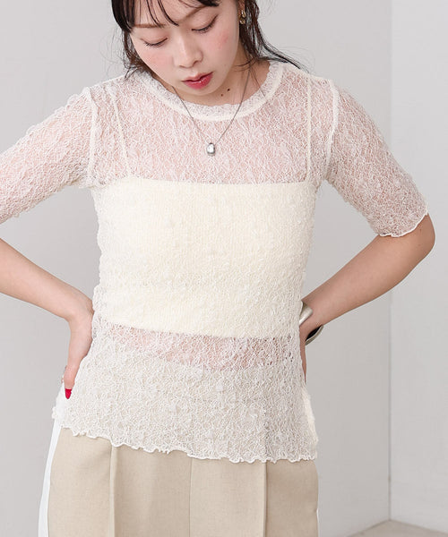 トレンドの重ね着スタイルが叶う、透け感のあるレーストップスが登場! 袖丈は、トライしやすい5分丈になっております。ビスチェやシャツのインナーに合わせるのもおすすめです。 軽やかな透け感が、さりげない女らしさを演出してくれて、レイヤードにもぴったりです。