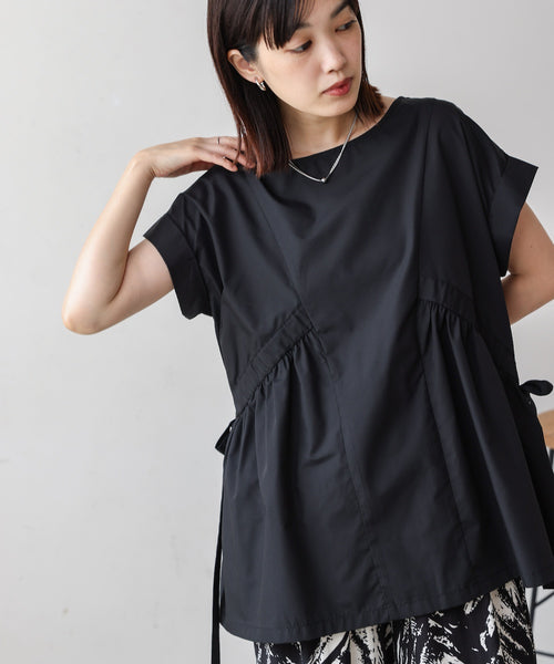 涼やかなシャリ感素材で、夏も快適に。 さりげないデザイン性が光る、ギャザーひも付きブラウス。枠部分に調整可能なギャザーひもを配し、シルエットに変化をつけられる遊び心のある一枚。お尻が隠れる安心丈で、体型カバーもしっかり叶えます。カジュアルにもキレイめにも使える万能アイテムです。
