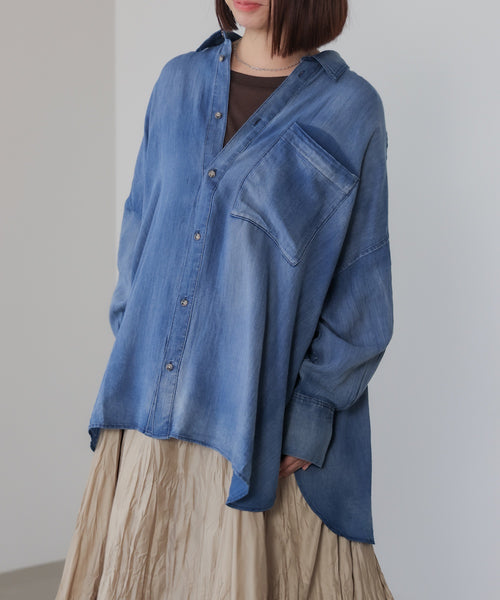 エアリーで軽く、肌当たりがさわやかなシアー素材を使用したデニムライクシャツ! 軽い綿素材をデニムを染めるように染色し、デニムの色みを再現しつつも、 驚くほど軽く涼しいシャツに仕上がっています◎ 暑い季節から日よけとして、冷房対策にと便利に使って頂けるアイテムです。 ゆったりとした身幅とぬけのある襟袖のつくりで、 羽織るだけで抜け感のあるこなれた印象に仕上げります◎