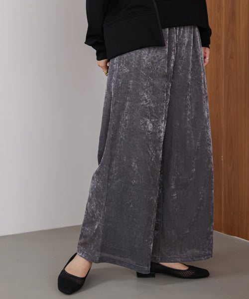 角度や動きで表面感がかわる、メッシュベロアを使用したイージーパンツ シンプルなトップスとあわせても気映える主役ボトムです! 少しだけシアー感のあるカットベロアを使用しているので、 まだ暑い時期から着用可能で、一足先に秋の雰囲気をとりいれられます。