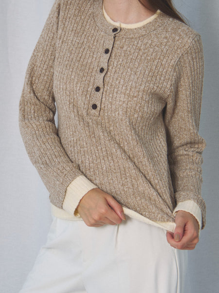 ミックスニットとレイヤード風の配色が着映えする一枚。首周りは2wayの雰囲気を楽しめるヘンリーネック仕様なので、ボタンをしめてクルーネックとしても、開けてスキッパー風としても◎ 程よい中肉素材で、一枚ではもちろんジャケットなどのインナーとしてもぴったりです。
