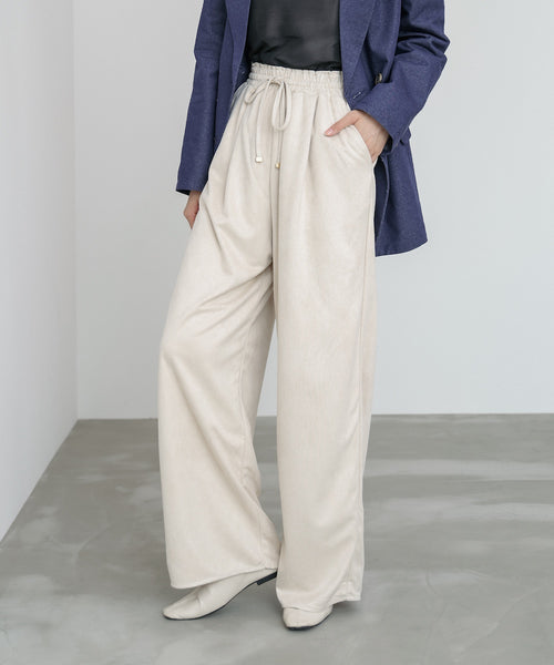 スエードのリラックスパンツが登場!秋らしさを出しながらもゆったりとノンストレスで履いていただけるアイテムになっています。ポケットもついていて実用性も◎きれいな落ち感でワイドよりのストレートパンツになっています。履くだけで一気に秋らしくなる、1枚持っていて使いまわしのきくパンツです。