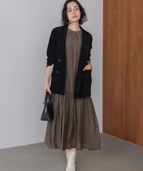縦方向に凸凹のある細かいシボが入ったサテン生地で、綺麗な落ち感が魅力のワンピース。ティアードの切替位置が膝上にあり、全体的に上にボリュームを出すことで目線が下がらず、ぺたんこ靴でもバランス良くまとまります。透ける心配がいらない裏地付きだから、お出掛けの時にも気軽にお召し頂きやすいのも魅力的◎落ち着いたカラートーンで、レイヤード次第でロングシーズンお楽しみ頂けます。