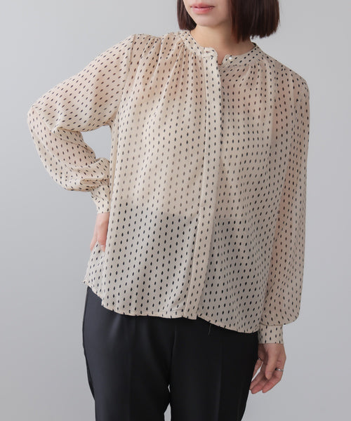 小さな柄が全体に散りばめられた、上品でやさしい印象のシフォンブラウス。きちんと感がありながらも堅くなりすぎず、お仕事や少し改まった場にも自然になじみます。一番上のボタンとカフスにはパール調ボタンをあしらい、顔まわりや手元にさりげない華やかさをプラス。前開き仕様なので着脱もしやすく、インでもアウトでも決まる丈感で着こなしの幅が広がります。しわになりにくく、忙しい日にも頼れる一枚です。