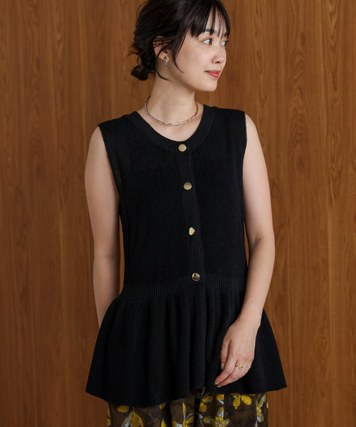 立体感のある畦編みが表情豊かなニットベスト。フロントにはゴールドボタンをあしらい、上品なアクセントと着脱のしやすさを両立。ウエストからふんわり広がるペプラムラインが、女性らしいシルエットを引き立て、スタイリングに華やぎを添えます。