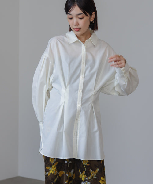 ウエストのタックがポイントのシャツブラウス。秋らしいカラーリングで、今すぐ着られる一枚です。気になるヒップをカバーするチュニック丈も嬉しい。チュニックとしてはもちろん、羽織やレイヤードのインナーとしても活躍する着回し力抜群のアイテムです。