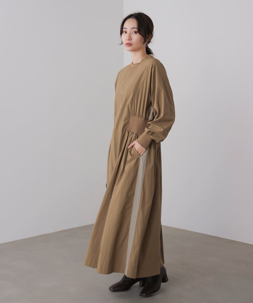 軽やかな素材とモードな配色が魅力のロングワンピース。 ウエストのゴムとサイドの切り替えがスタイルをすっきり見せてくれます。