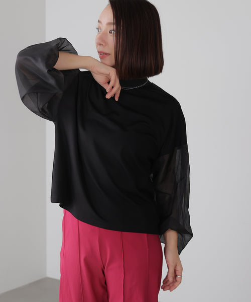 さりげなく華やかで、きちんと感も忘れない。大人の女性にちょうどいいシアープルオーバーです。ふんわりとしたバルーン袖に、シアー素材をつかったデザインが目を引く一枚。袖部分はきらめき感のある素材なので、光を受けるたびに上品な華やかさをプラスしてくれます。女性らしさとかわいらしさがありながら、首元はボトルネックですっきりとした印象に。甘くなりすぎず、大人コーデにも取り入れやすいバランスです。身幅はゆったりめで、体のラインを拾いにくく安心して着られるのも嬉しいポイント。パンツにもスカートにも合わせやすく、オンにもオフにも活躍します。