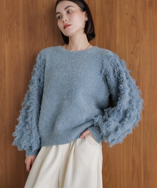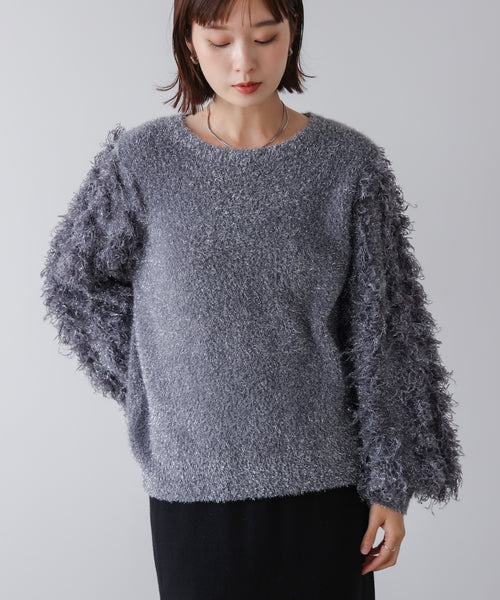 光沢ラメニットで仕立てた華やかさが魅力のニットプルオーバー。 フリンジを織り交ぜた立体感のあるスリーブがアクセントになりより印象的に。 ゆったりとしたシルエットでラフに着用出来るのも嬉しいポイント。 ボトムを選ばず、様々なシーンで活躍してくれる今季おすすめのアイテムです。