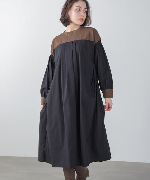 一枚で着映えが完成する、大人のための上品ワンピース。異素材の組み合わせが程よいメリハリを生み、きちんと感とリラックス感を両立します。忙しい毎日でも、さっと着るだけで洗練された印象に。ゆとりのあるシルエットで体のラインを拾いにくく、自然に体型をカバーします。袖ぐりに寄せたギャザーが、さりげない可愛さを添えるアクセント。切り替え位置を高めに設定し、脚をすらりと長く見せてくれるのも嬉しいポイントです。