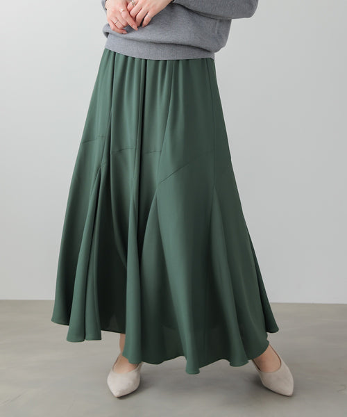 パネル切替で美しいフレアラインを描く、大人のためのパネルフレアスカート。 縦のラインを強調する切替デザインが、腰まわりをすっきりと見せながら、裾に向かって自然な広がりを演出します。 程よい落ち感のある素材を使用し、歩くたびに揺れるシルエットが上品な印象に。 フレアスカートながら甘くなりすぎず、きれいめにもカジュアルにも合わせやすい一枚です。 ウエストはストレスフリーな仕様で、長時間の着用も快適。