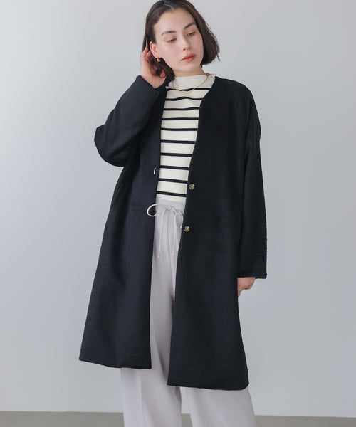シンプルで上品な大人のロングコート。ノーカラーでゆるくウェーブしたVネックと細くシンプルな飾りボタンが洗練された印象を醸し出します。寒い冬のお出かけや通勤にぴったりな高見えコートです。