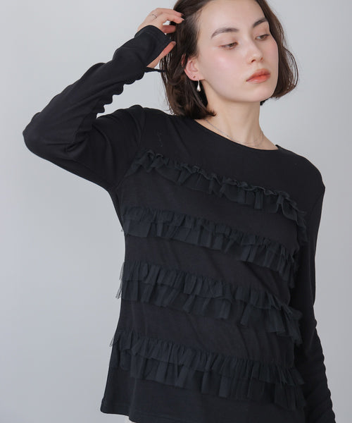 段々になったフリルが特徴のニットトップス。やさしいチュールフリルで女性らしさを出しつつ、落ち着いた色味で大人のきれいめニットトップスとなっています。冬はインナーとして、秋や春には1枚で着映えするアイテムなのでロングシーズン使えます。