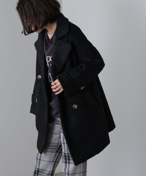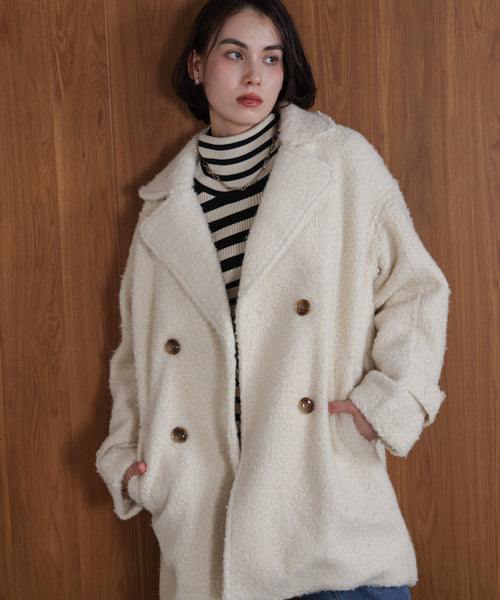 デザインはシンプルなピーコートを思わせるダブルコート。ゆとりのあるサイズ感で、ボリュームのあるトップスとも◎後ろの裾にベンツ開きを入れ女性らしい優しいフォルムも◎ボタンはナチュラルなカラーとマーブルが特徴なスコッチ釦を使用し、程よいカジュアルテイストをプラスしています。 羽織るだけでこなれた雰囲気に。ヒップを程よくカバーしてくれる、長すぎない丈感はは通勤にも休日のお出かけにも活躍する、秋冬の万能アウターです。