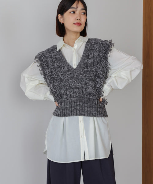 ループフリンジとケーブル編みが存在感を放つ、旬なデザインのニットベスト。Vネックと短丈シルエットで、ニットでもすっきり細見えするのが魅力です。ウエスト部分は長めのリブ仕様で自然にスタイルアップが叶い、ハイウエストのボトムやワンピースにも好相性。 シャツやカットソーとレイヤードするだけで今っぽく仕上がります。