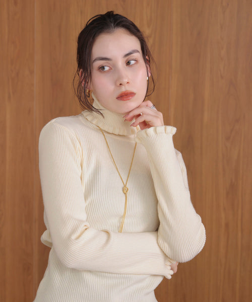首元と袖口にさりげなくあしらったフリルが、女性らしい柔らかさを演出するリブニットタートル。 程よくフィットする細リブ素材で、ボディラインをすっきりと美しく見せてくれます。 シンプルながらもディテールにこだわったデザインで、1枚着はもちろん、 ジャケットやワンピースのインナーとしても活躍。オン・オフ問わず着回しやすく、季節の変わり目から冬本番まで長くお使いいただける万能アイテムです。