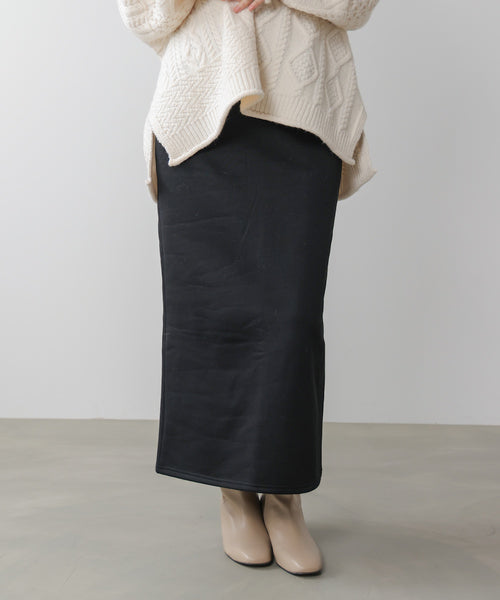 汎用性の高いシンプルなタイトシルエットを採用した裏起毛素材のスカート。程よく肉感があり、ラインを拾いにくいので安心して着用いただけます。きれいな見え感と履きやすさを兼ね備えた嬉しい1着。足元に抜けが出るように、後ろにはスリットをオンしました。流行問わず履いていただけるような便利なスカートです。