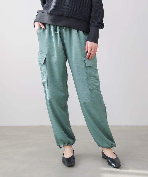 カジュアルに見えがちなカーゴパンツを光沢感のあるサテン生地できれいめ上品に着られるよう仕上げました。 ウエストは紐もついたゴム仕様で楽ちんで快適。デイリーボトムスとして活躍します。
